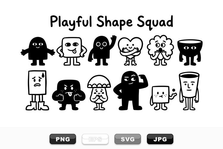 Playful doodle shows eleven anthropomorphic shapes in black and white line art, suitable for stickers, kids prints, and branding, cheerful