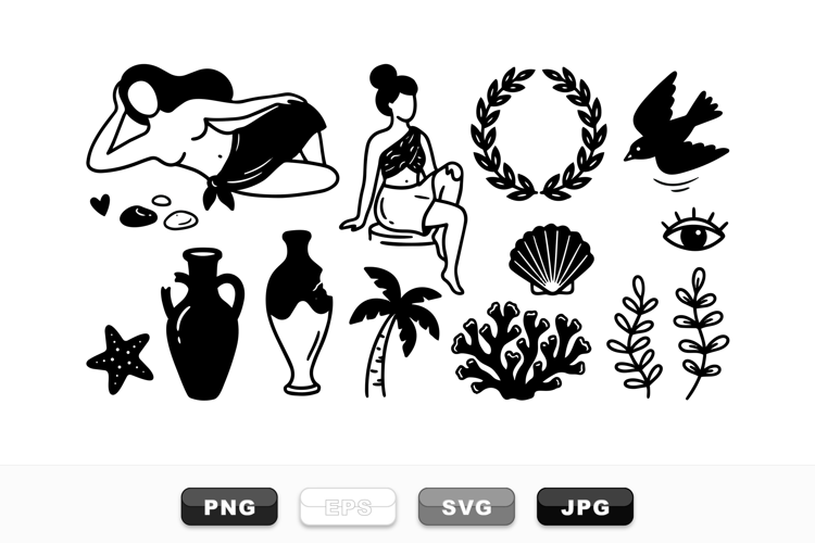 A tattoo flash sheet depicts classical mermaid like figures, shells, vases and marine motifs for apparel or sticker design, bold.