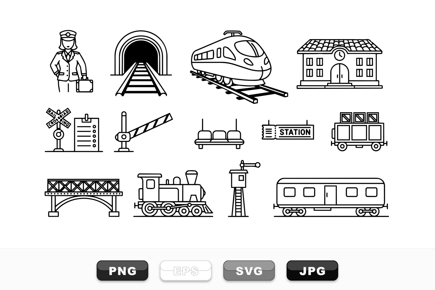 A minimalist line art icon set depicts trains, tunnel, station, conductor and rail infrastructure for transport signage and editorial use, clean.