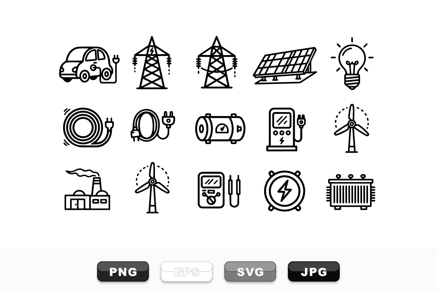 A minimal line art vector icon set depicts renewable and electrical energy elements for web and app use, clear and technical.
