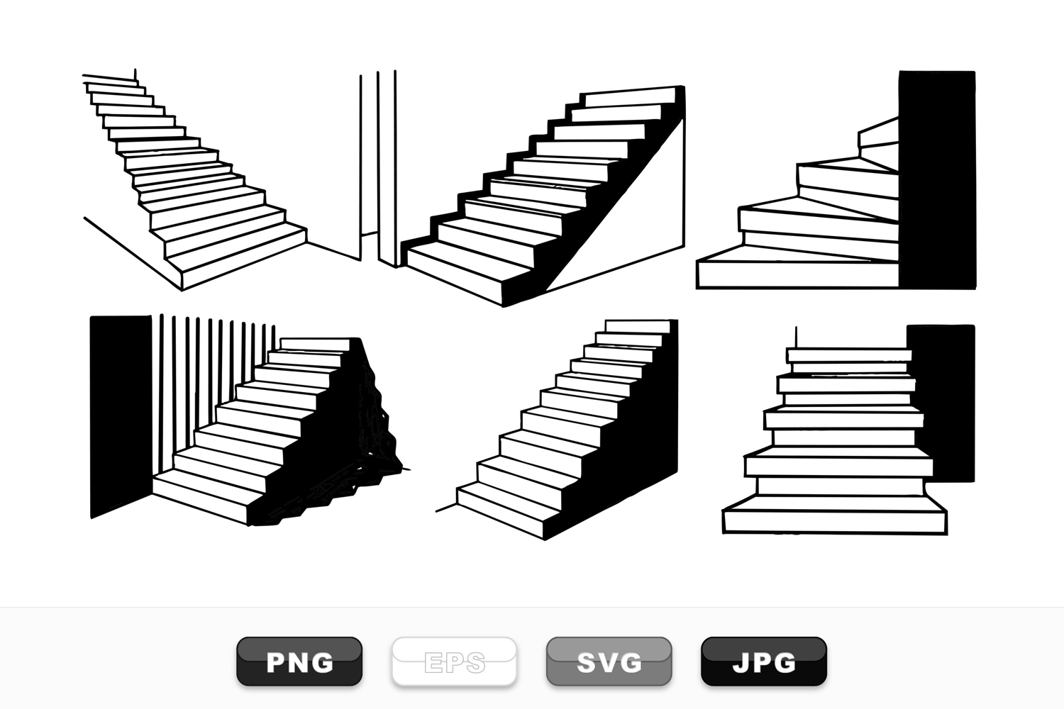 Minimalist vector illustration displays six staircases from various angles with bold black shadow details and clean geometric lines in monochrome style.