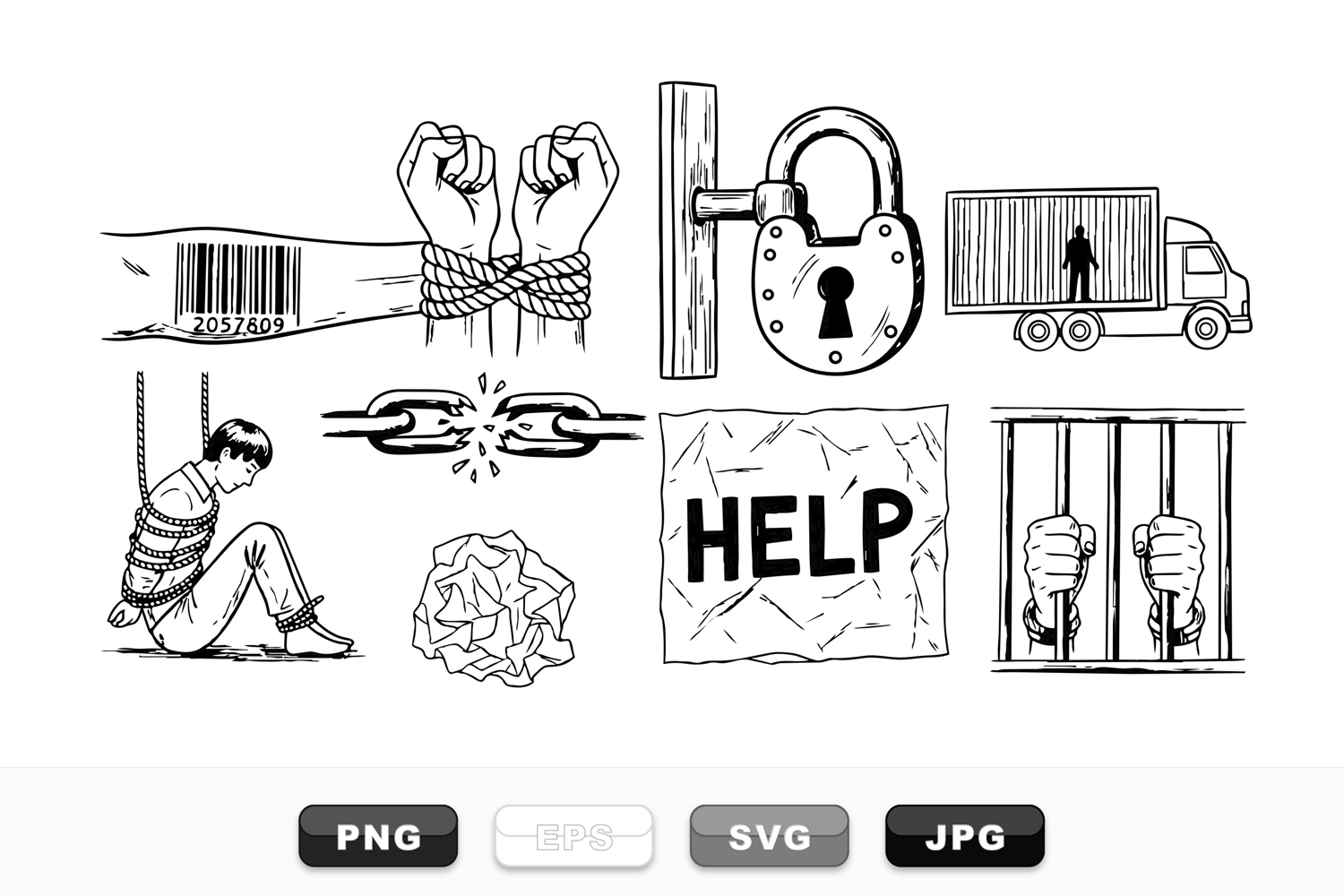 Hand Drawn Clipart Captivity Vector Set Freedom Concept Art Prisoner Silhouette Design Breaking Chain Illustration Help Sign Vector Locked Padlock Clipart Cargo Container Graphic Rope Bondage Drawing Imprisonment Awareness Bundle