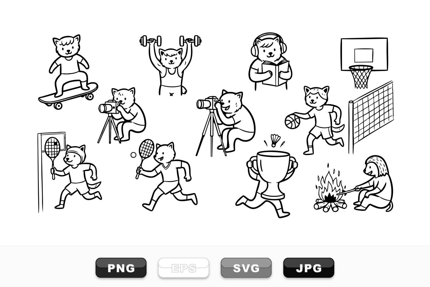 A collection of monochrome cat characters involved in skateboarding, weightlifting, tennis, basketball, photography, reading, and campfire scenes in simple line art style, conveying lively and casual atmosphere.