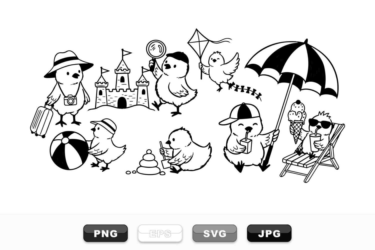 Summer Vacation Art Kids Craft Clipart Playful Bird Illustrations Black White Vector Vector Animal Set Cute Summer Chicks Beach Holiday Vector Children Summer Designs Line Art Clipart Pack Summer Leisure Graphics