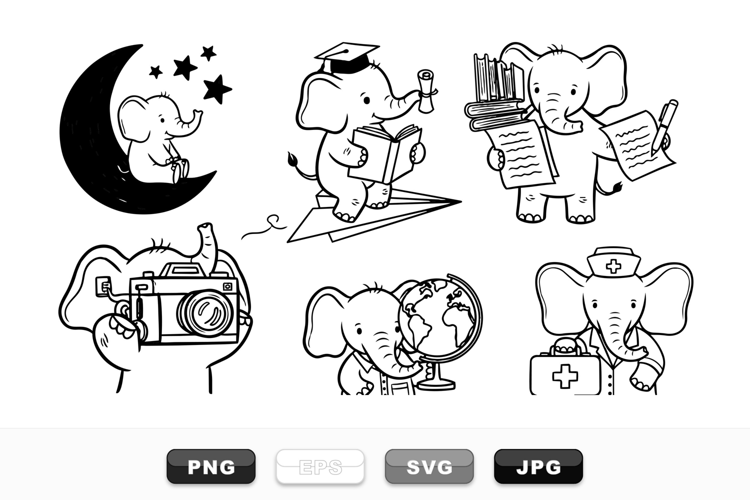 Cute baby elephants depicted in simple black line art, showing various roles including student, photographer, and nurse in charming playful style.