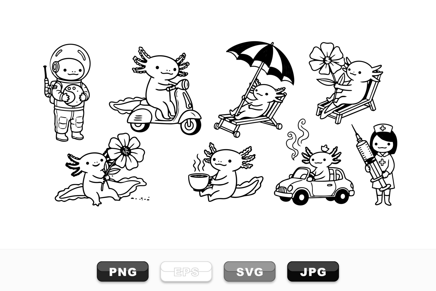 Playful black line vector shows axolotl characters performing activities like astronaut, scooter, sunbathing, tea, driving and nurse, versatile and whimsical