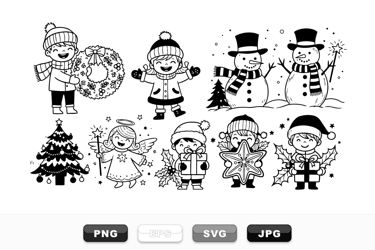 Hand drawn black and white vector art set showing smiling children holding wreaths and gifts, joyful angel, snowmen with hats, and decorated christmas tree with festive details.