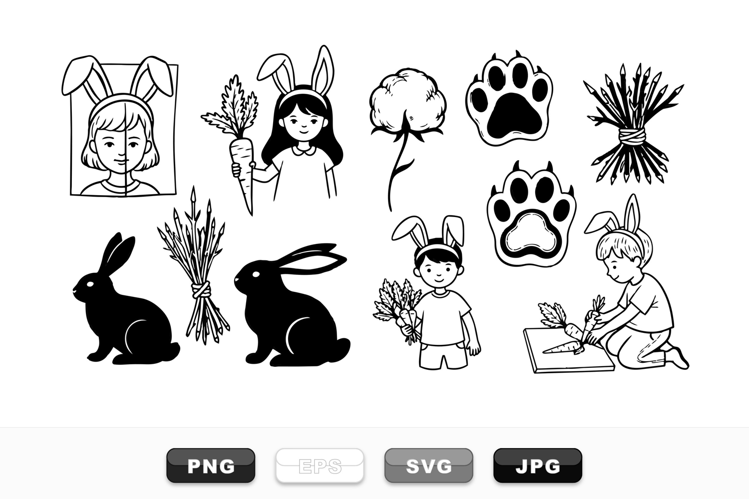 Commercial Use Svg Bunny Svg Bundle Hand Drawn Bunny Diy Easter Decor Printable Kids Activity Spring Holiday Graphics Easter Carrot Clipart Rabbit Craft Pack Black White Illustrations Scrapbooking Bunny Elements
