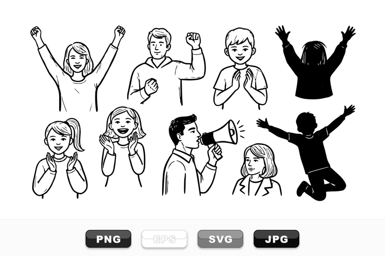 Hand Drawn People Communication Icon Set Gesture Vector Clipart Celebration Pose Set Cheering People Illustration Happy Character Bundle Silhouette Figure Pack Jumping Person Clipart Casual Man Drawing Woman Clapping Graphic