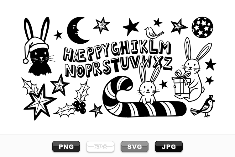 Black and white vector art features playful rabbits with christmas elements, candy cane stripes, stars, holly, and a holiday themed alphabet, creating a festive winter mood.