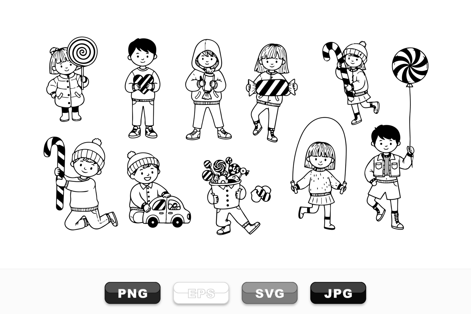 A charming black and white line art set of joyful children holding candy canes, lollipops, toys, balloons, and skipping rope in playful dynamic poses and simple style.
