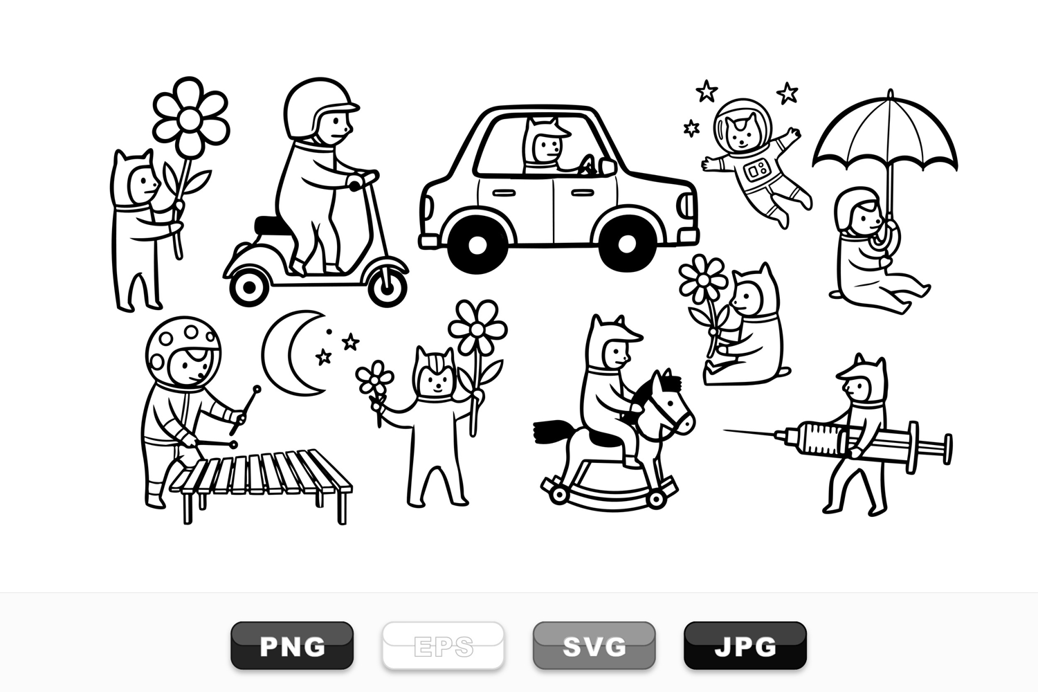 Minimalist line art vector shows playful characters wearing animal suits riding vehicles, playing music, holding flowers, and sitting under umbrella, creating whimsical lighthearted mood.