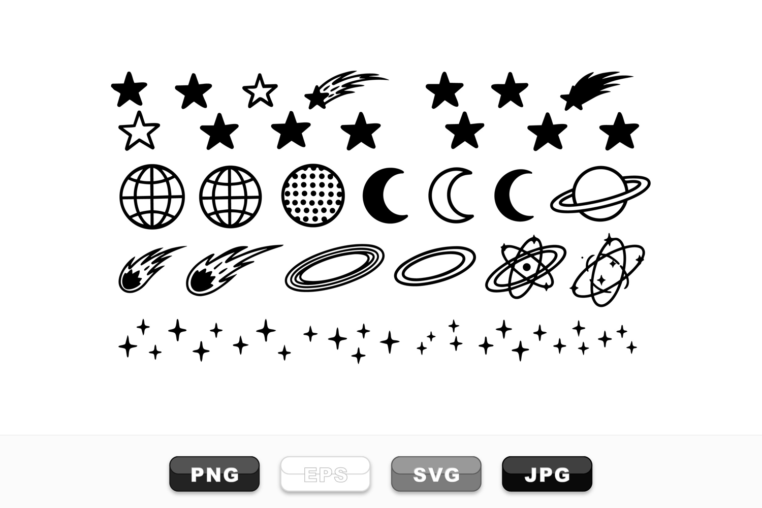 A collection of hand drawn vector icons featuring stars, moons, planets, comets, atomic symbols and sparkles in classic black silhouette design, simple and vintage aesthetic.