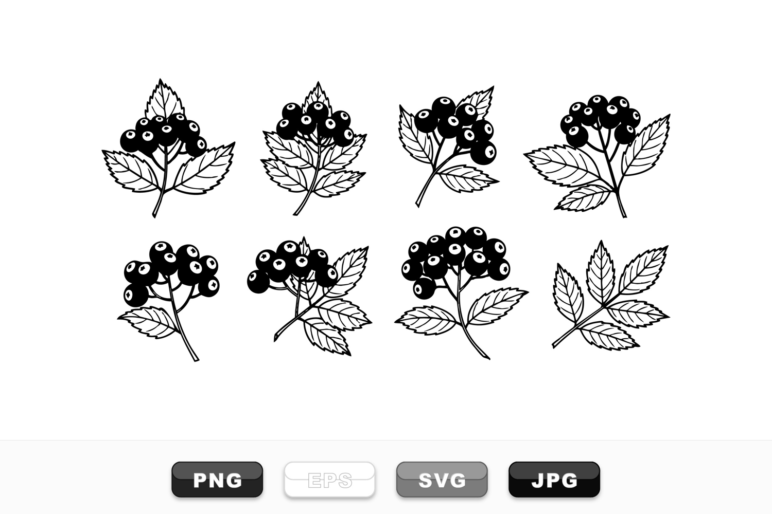 A collection of eight black elderberry clusters with intricately drawn leaves using vintage hand drawn line art style great for botanical prints and natural health designs calm