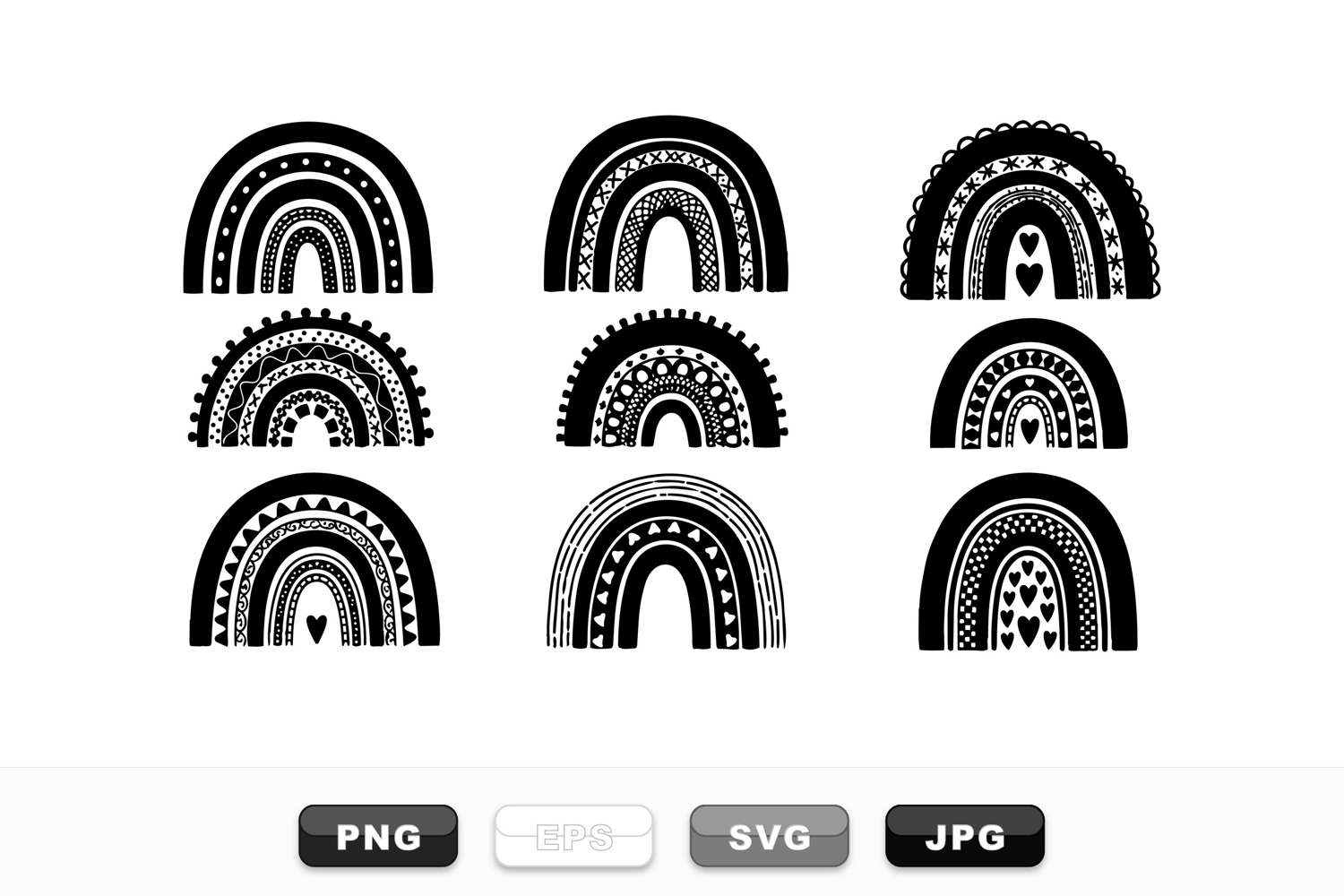 Monochrome hand drawn folk art style rainbows with intricate hearts, dots, and stripes pattern details in black on white background, showcasing folk charm and simplicity.
