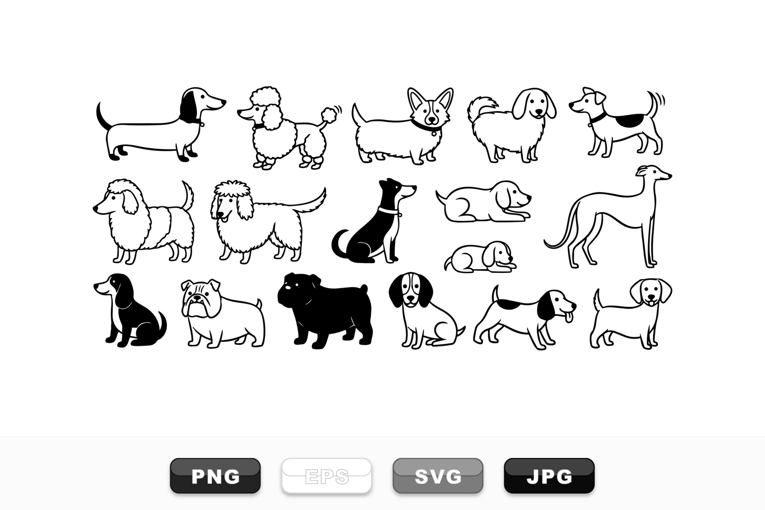 Line art vector shows various dog breeds in simple black and white style with minimal details, ideal for pet related graphics, playful and clean mood.