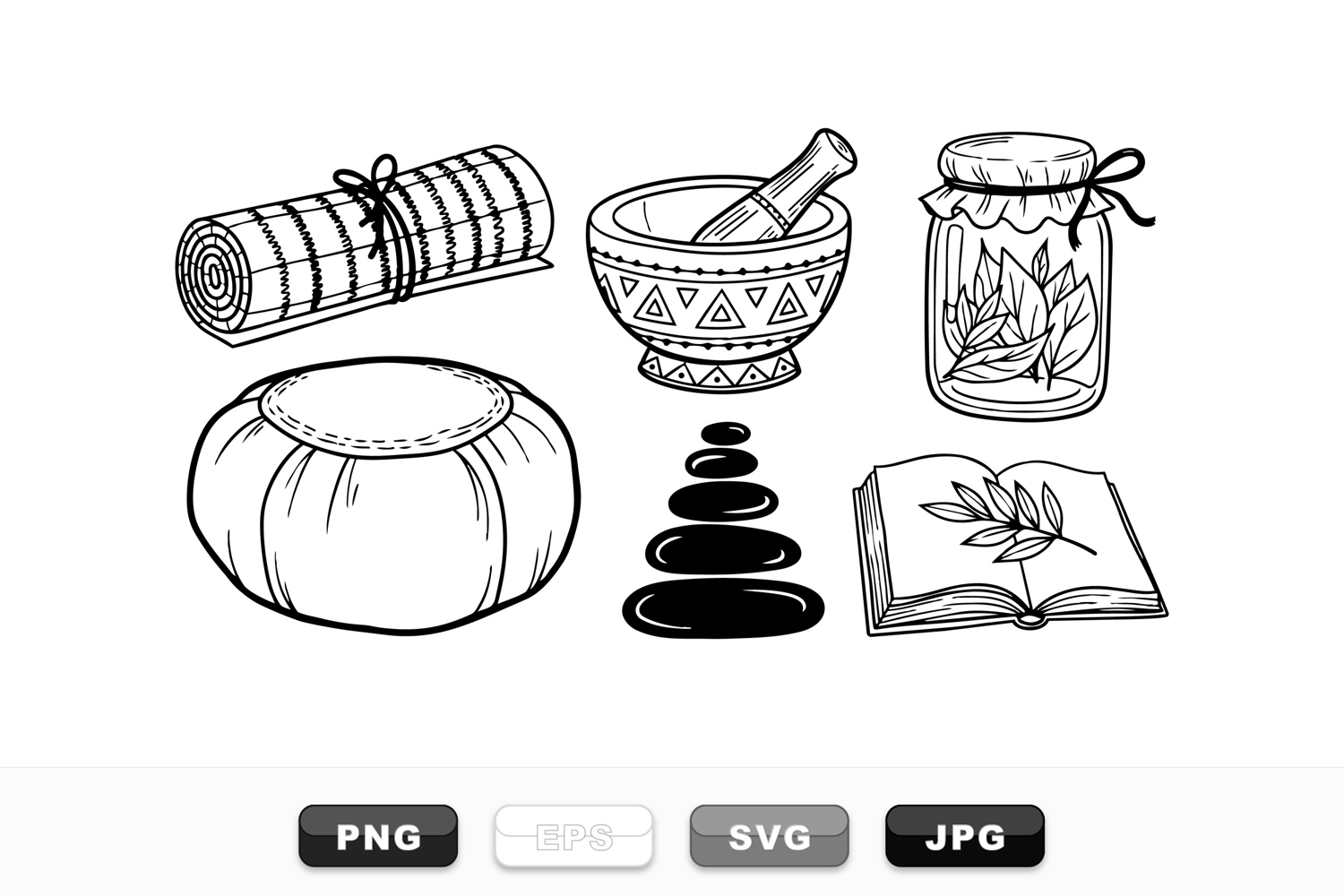 Hand drawn vector art set includes wellness icons such as rolled mat, mortar and pestle, herbal jar, cushion, stacked stones, and open book for spa or health illustrations.