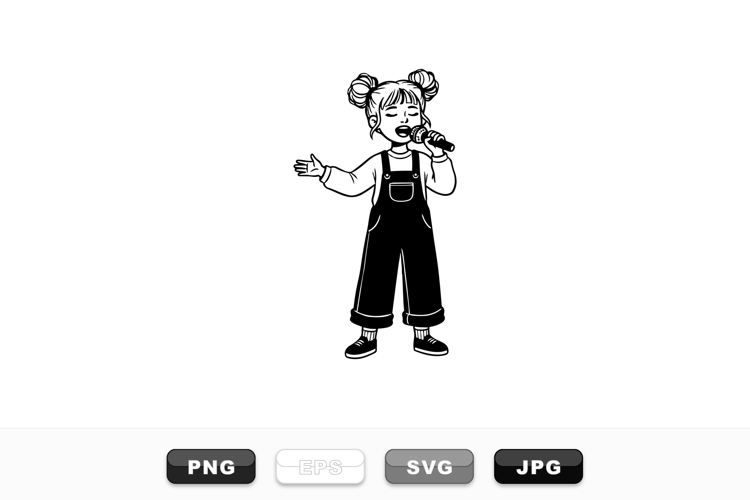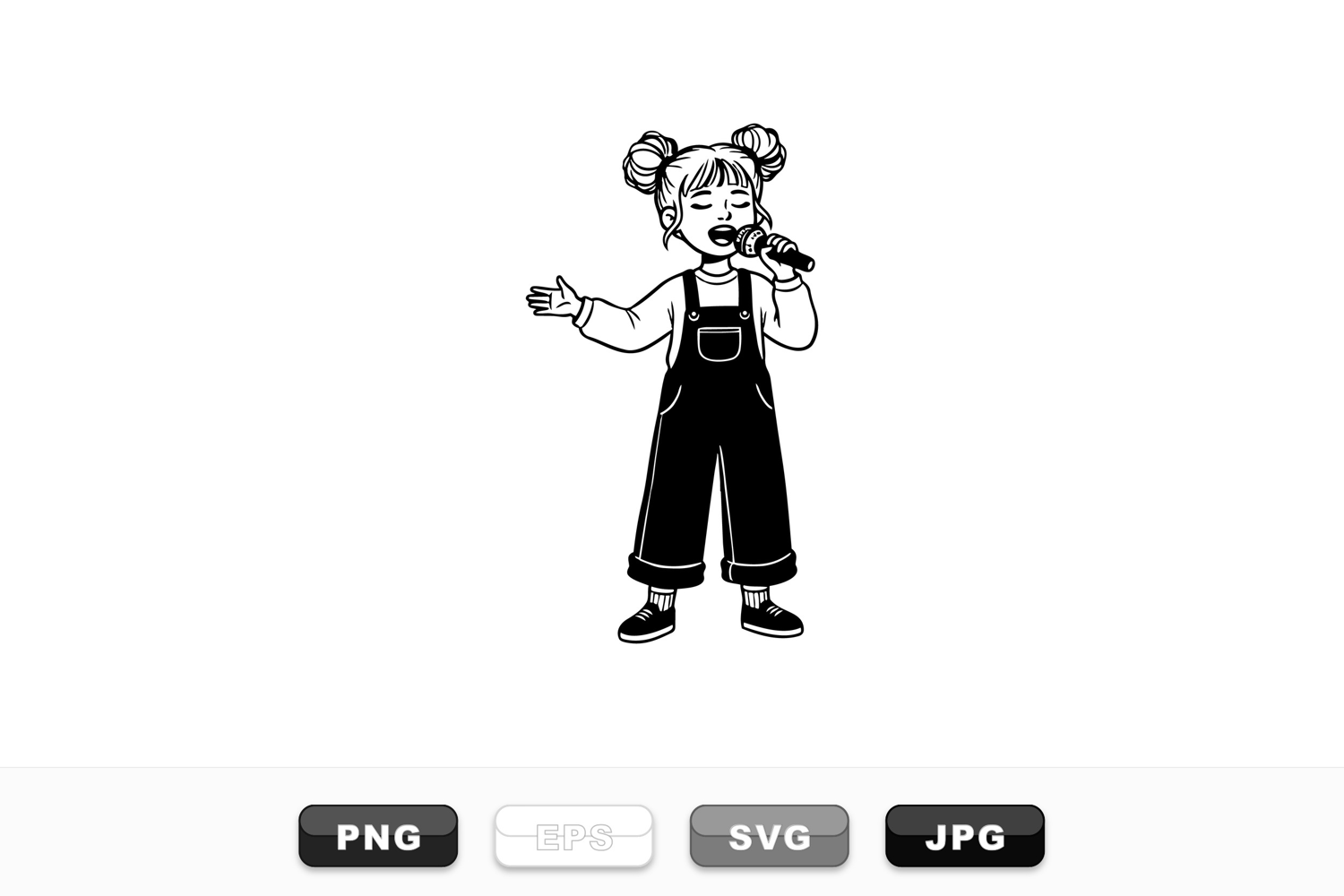 A simple minimalist vector illustration of a young girl singing passionately with eyes closed, wearing casual overalls and stylish space buns hairstyle, peaceful mood.
