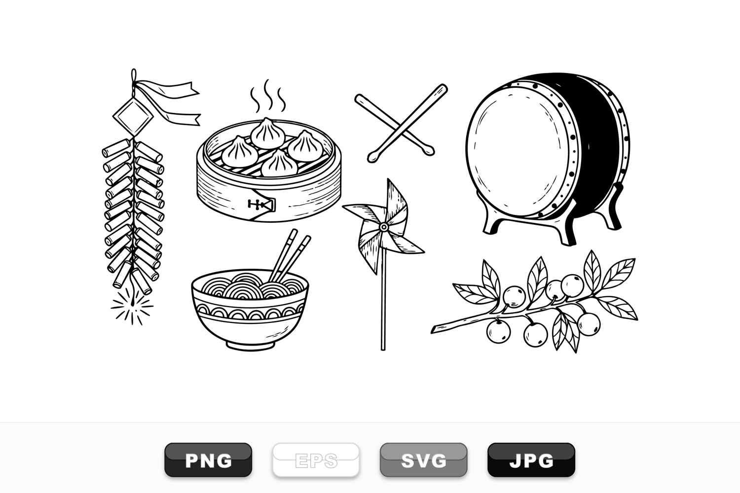 Delicate hand drawn black and white vector art showcases steaming dumplings, firecrackers, drum, pinwheel, and fruit branch in detailed line style, conveying traditional festive mood.