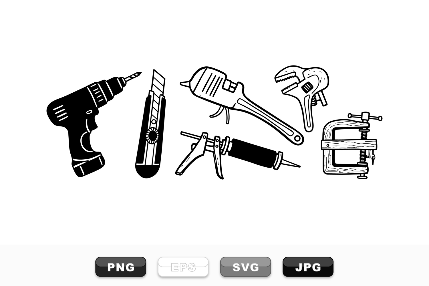 A vintage style black and white hand drawn tool set featuring an electric drill, cutter, utility knife, glue gun, wrench, and clamp for construction and repair projects.