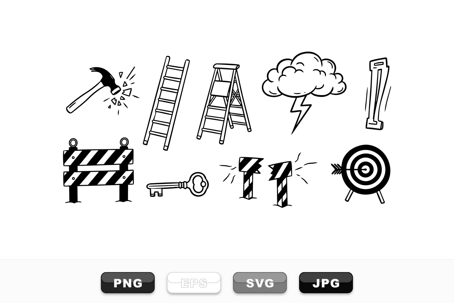 Line Art Illustrations Black And White Icons Construction Icon Set Hand Drawn Tools Building Tool Graphics Ladder And Hammer Repair And Safety Electric Hazard Clipart Target And Key Icons Worksite Graphic Kit