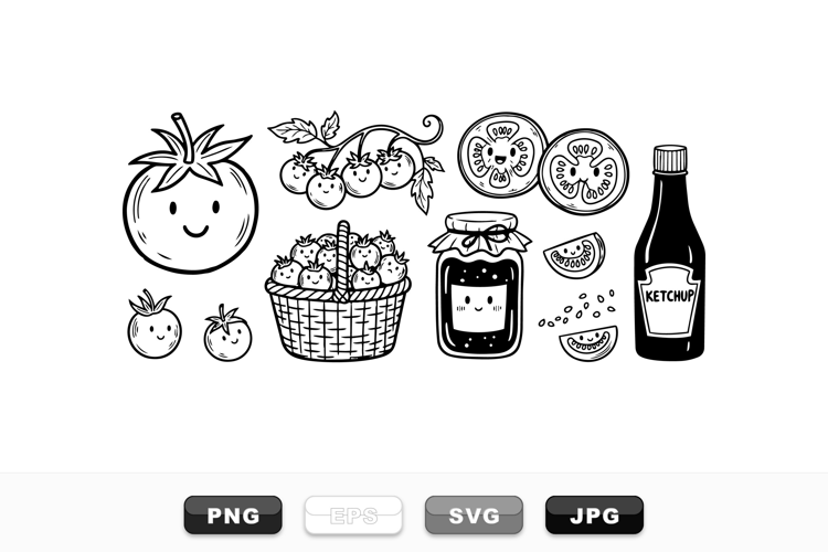 Playful line art depicts smiling tomato characters with jar and ketchup, useful for labels, stickers, packaging, whimsical.