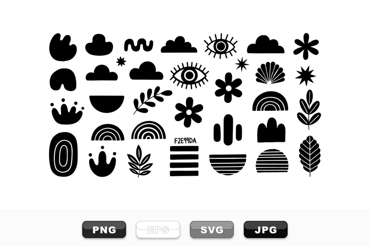 A collection of minimalist black and white abstract shapes including eyes, flowers, clouds, rainbows, and leaves arranged in a clean pattern with graphic style.