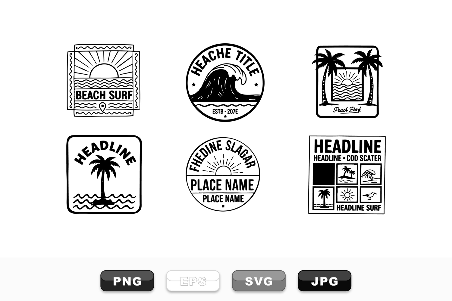 A vintage badge vector set displays six surf and beach stamps for branding, apparel, stickers, nostalgic mood.