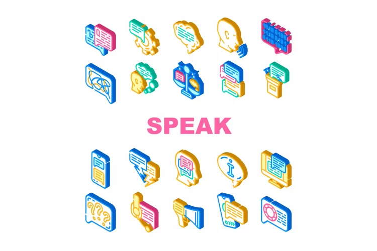 Speak Conversation And Discussion Icons Set Vector. Online Support Advice And Chatting, Speech From Tribune And Sms Message, Human Speak And Talk With Advisor Isometric Sign Color Illustrations. Formats: JPG, EPS