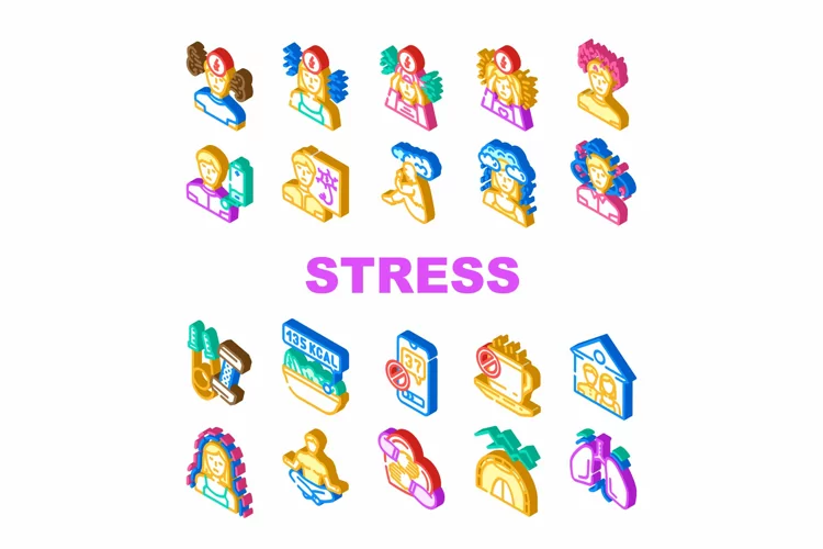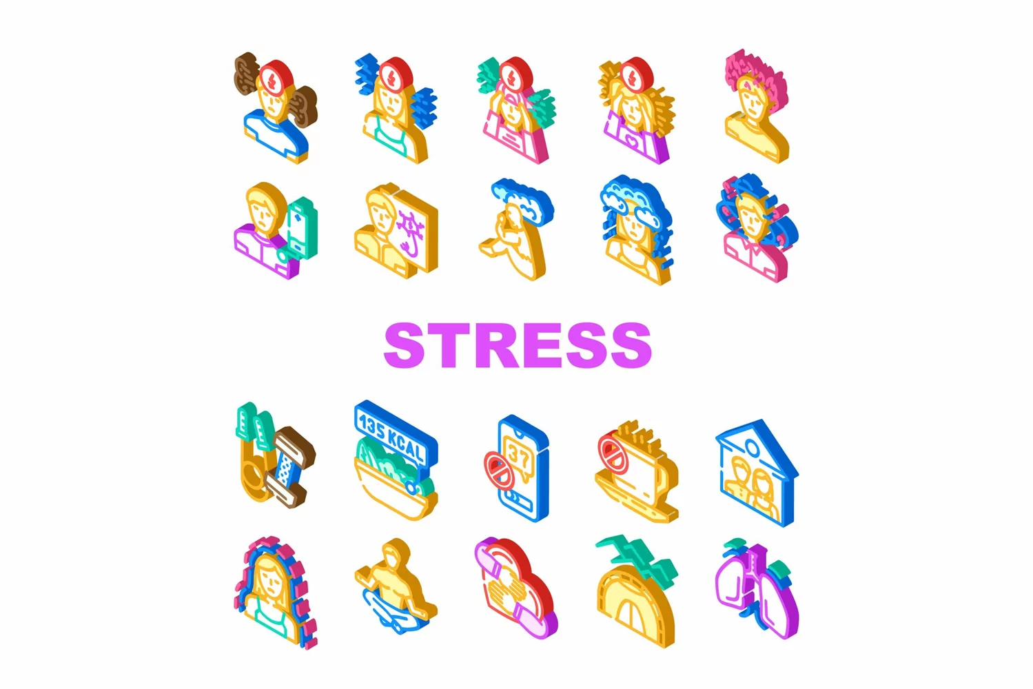 stress headache depression icons set vector. stressed problem, woman sad, person business, tired pain, head adult, depressed stress headache depression isometric sign illustrations