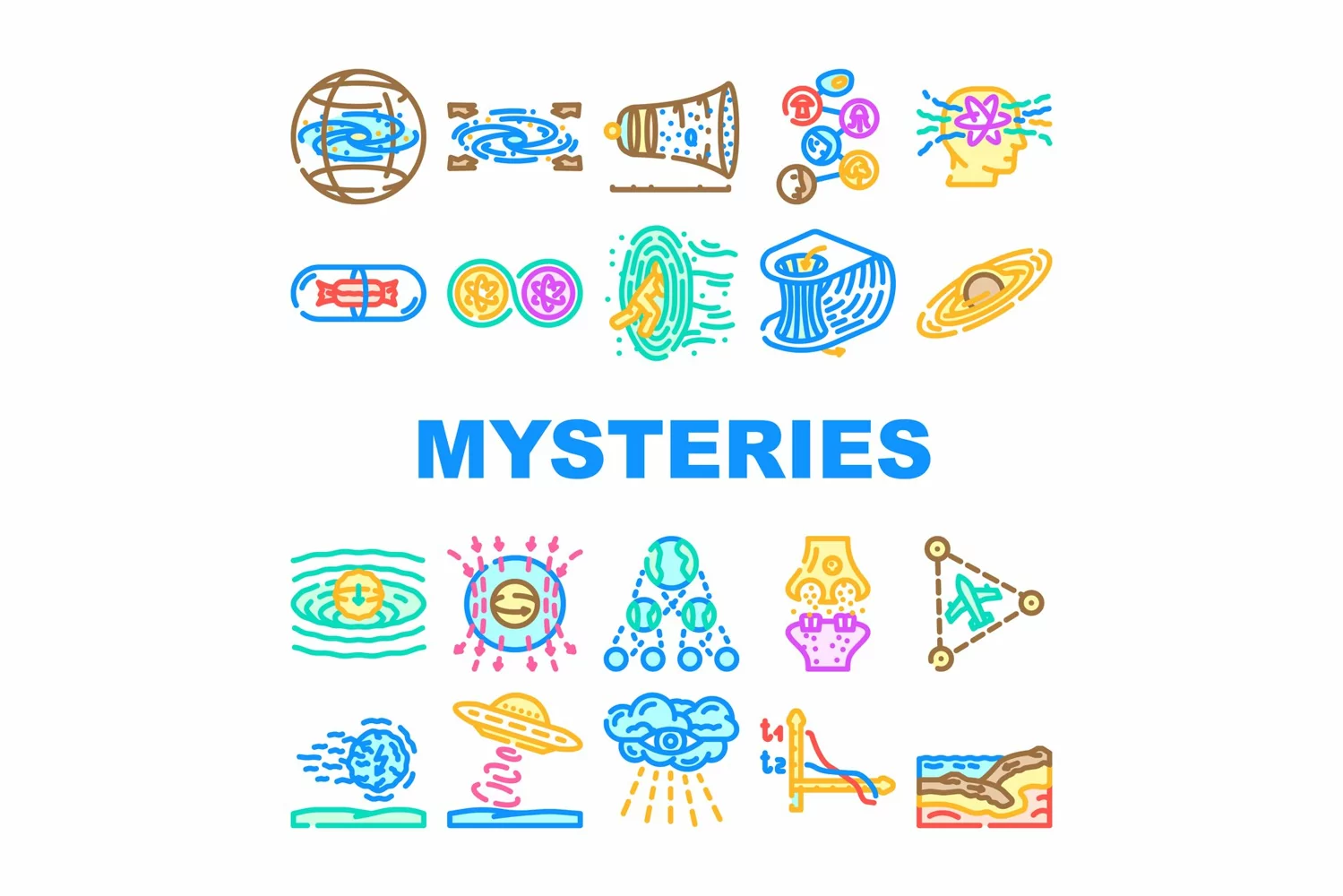 unsolved mysteries question ask icons set vector. black holes, dark matter, energy, origin universe life, consciousness, time travel unsolved mysteries question ask color line illustrations
