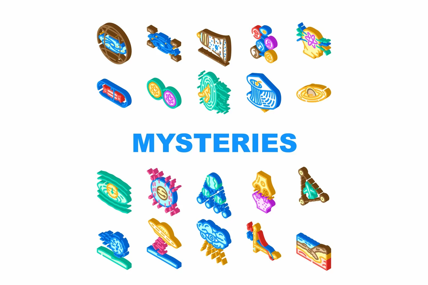 unsolved mysteries question ask icons set vector. black holes, dark matter, energy, origin universe life, consciousness, time travel unsolved mysteries question ask isometric sign illustrations
