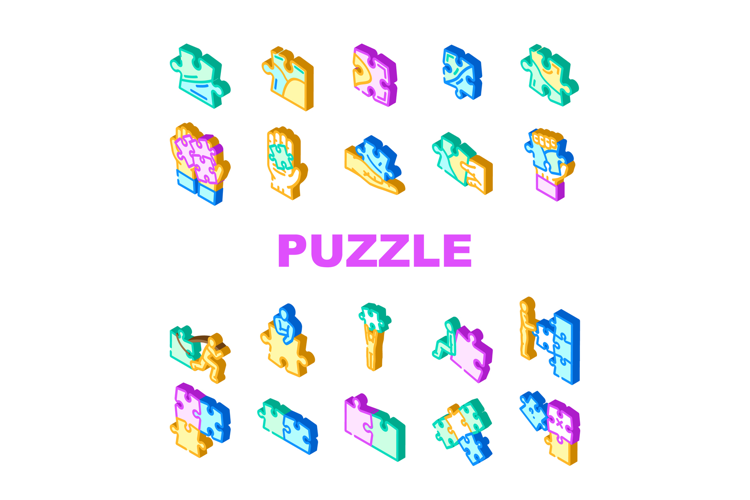 puzzle game jigsaw riddle icons set vector. conundrum, brainteaser cryptogram, maze, rebus anagram, logic, tangram puzzle game jigsaw riddle isometric sign illustrations