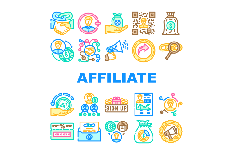 affiliate referral program sales icons set vector. commission partner, network, marketing, earnings, revenue, conversion, traffic affiliate referral program sales color line illustrations