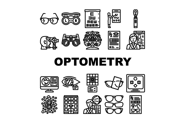 optometry vision eyewear icons set vector. glasses contacts, eyehealth, refraction astigmatism, myopia, hyperopia optometry vision eyewear black contour illustrations