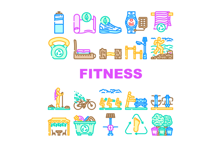 sustainable outdoor fitness eco icons set vector. friendly, green, fitness, workout, exercise wellness, environmental, conservation sustainable outdoor fitness eco color line illustrations