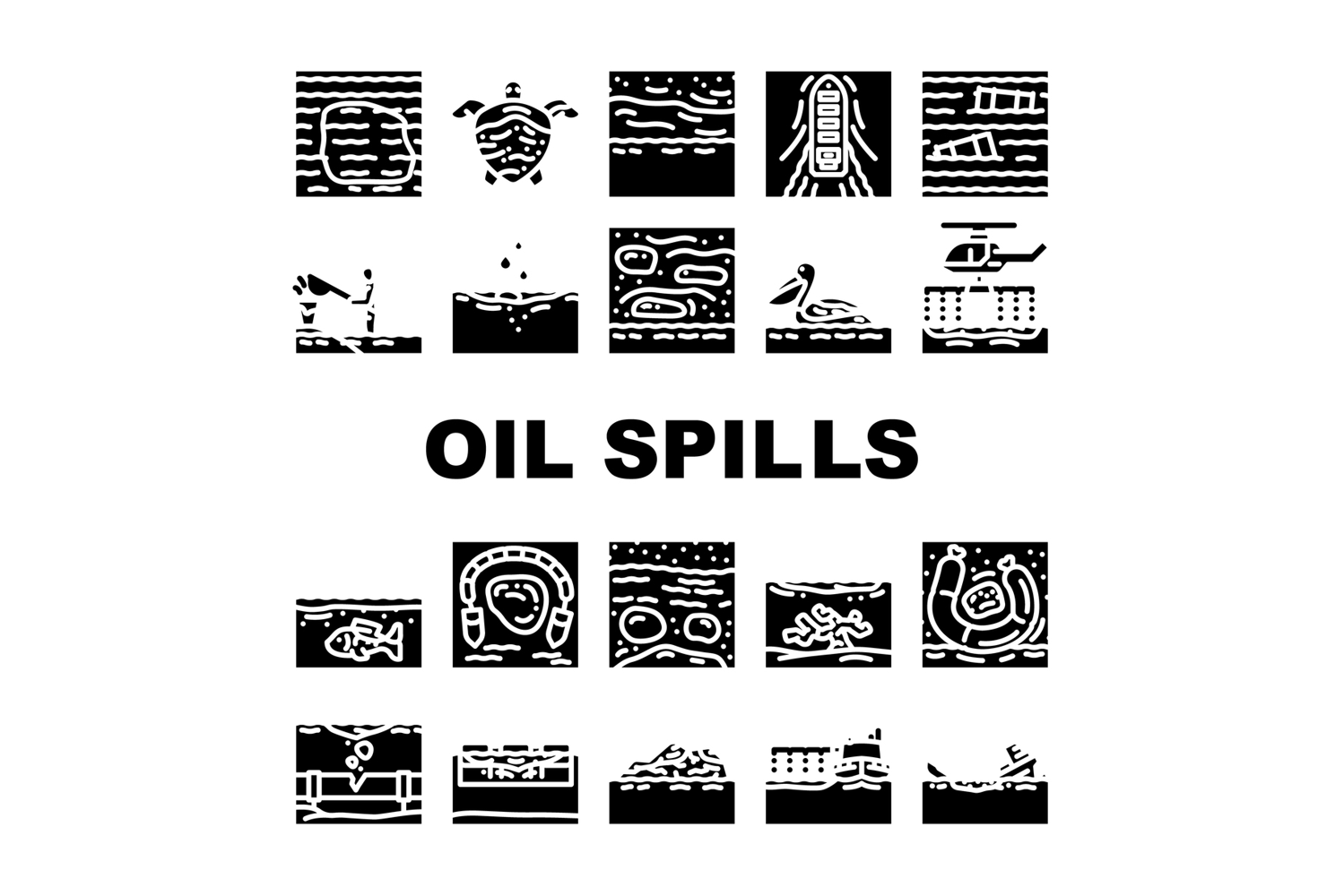 oil spills pollution icons set vector. environment contamination, cleanup, marine ecosystem, wildlife, hazardous, petroleum oil spills pollution glyph pictogram Illustrations