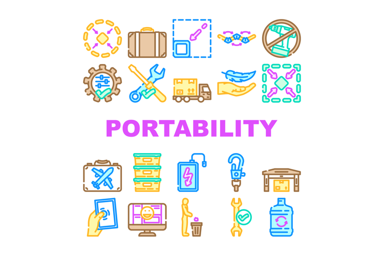 portability convenience product icons set vector. portable, compact, lightweight, foldable, collapsible, travel friendly, mobile portability convenience product color line illustrations