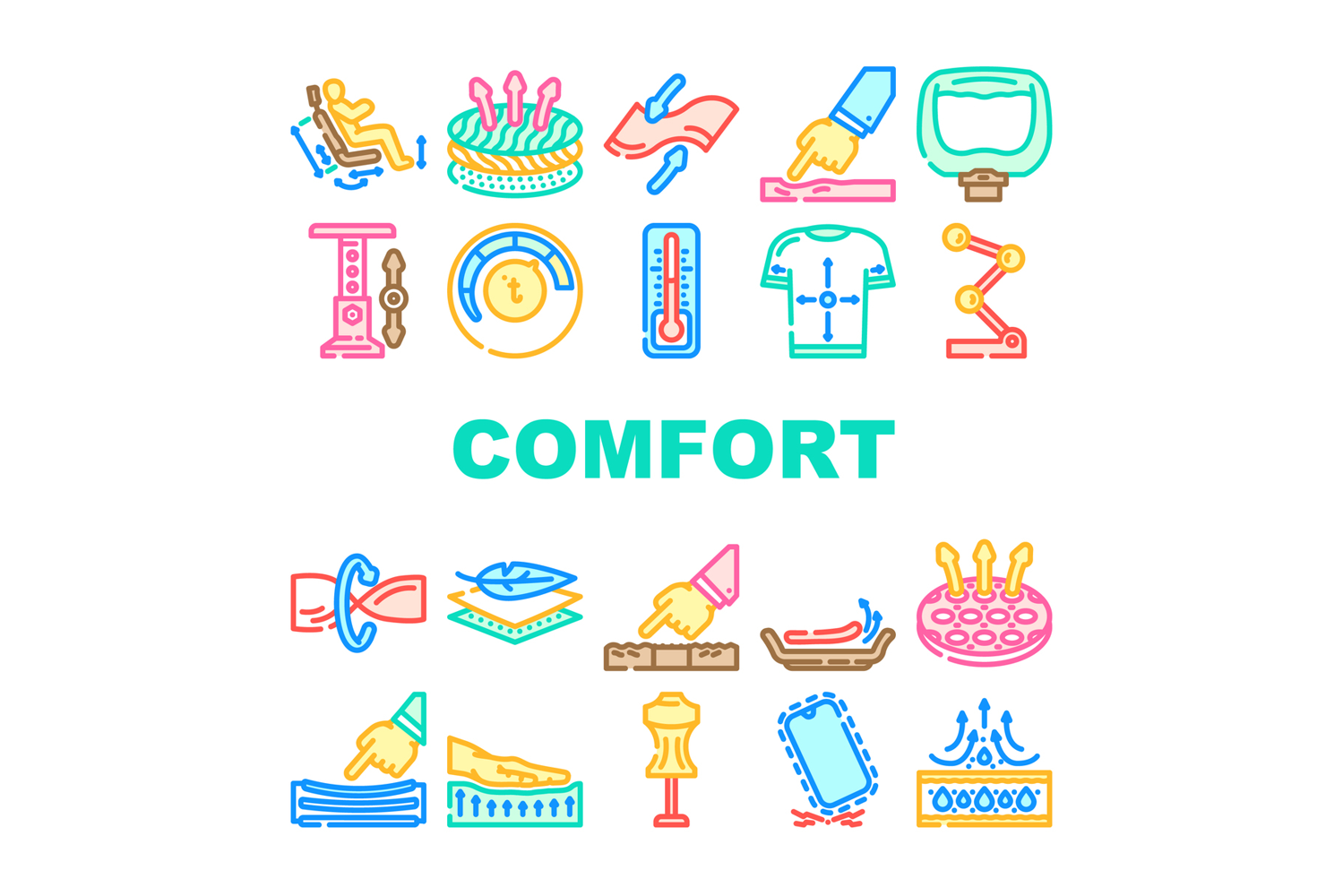 comfort useability product icons set vector. ergonomic intuitive, durable, versatile portable, reliable, efficient sleek, compact comfort useability product color line illustrations