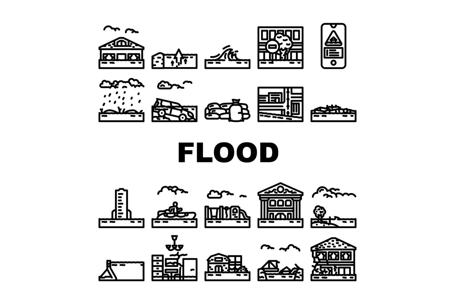 flood water disaster storm icons set vector. rain river, surge inundation, overflow emergency, evacuation, rescue, damage flood water disaster storm black contour illustrations