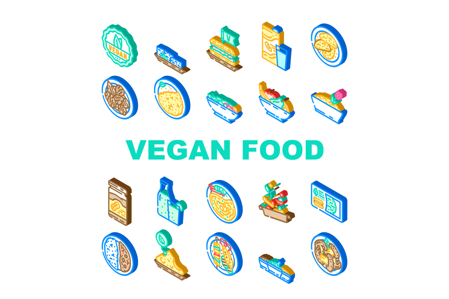 vegan food diet organic icons set vector. vegan plant based, cruelty free, organic, sustainable, tofu tempeh, seitan, legumes vegan food diet organic isometric sign illustrations