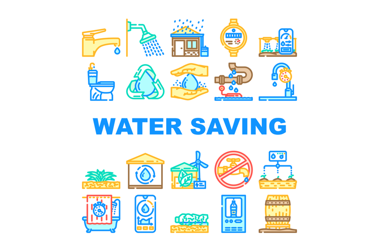 water saving conservation reuse icons set vector. efficiency sustainability, drought harvesting, xeriscaping greywater, rainwater drip water saving conservation reuse color line illustrations