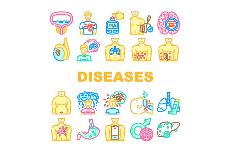 men diseases prostate cancer icons set vector. diabetes hypertension, obesity depression, heart stroke, erectile osteoporosis men diseases prostate cancer color line illustrations