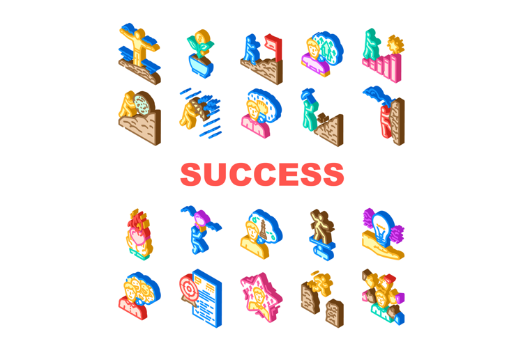 success life achievement goal icons set vector. motivation ambition, perseverance discipline, focus growth, mindset, resilience success life achievement goal isometric sign illustrations