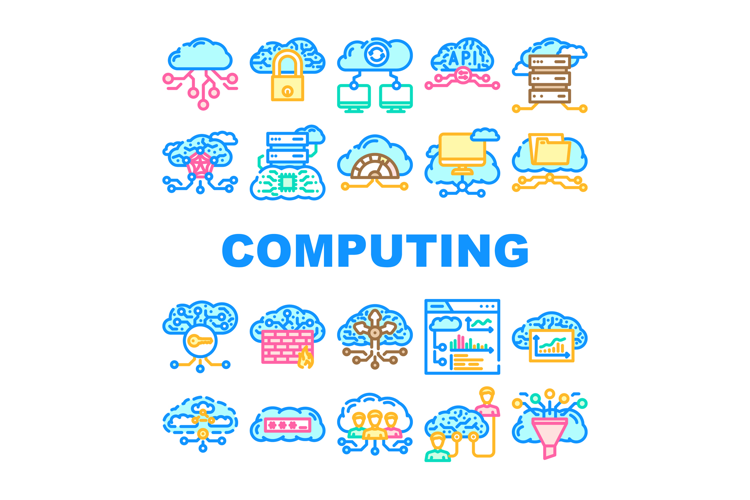 cloud computing virtualization icons set vector. scalability infrastructure, storage security, deployment automation, networking cloud computing virtualization color line illustrations
