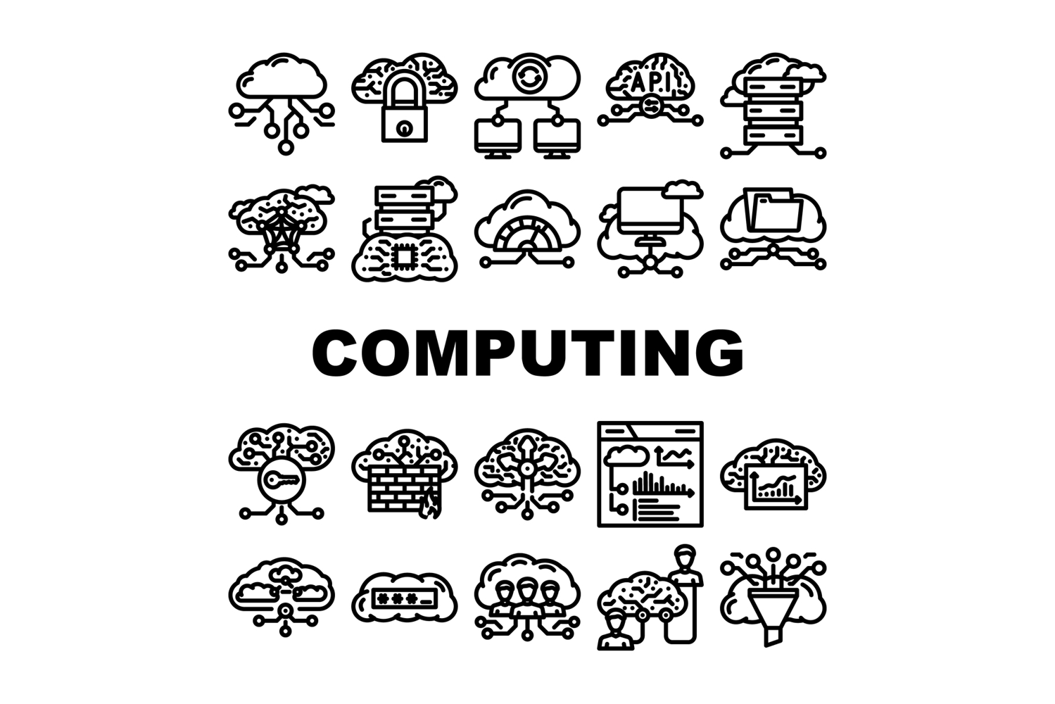 cloud computing virtualization icons set vector. scalability infrastructure, storage security, deployment automation, networking cloud computing virtualization black contour illustrations