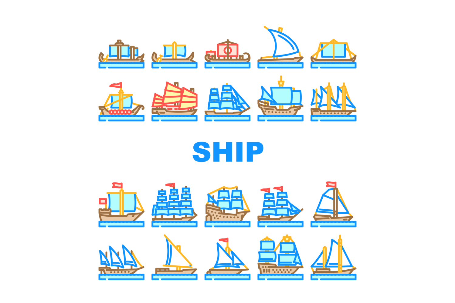 ancient ship maritime vessel icons set vector. navigation exploration, trade discovery, seafaring, shipwreck, galleon, trireme ancient ship maritime vessel color line illustrations
