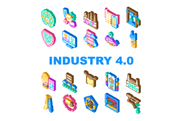 industry 4 automation robotics icons set vector. cybersecurity bigdata, analytics cloud, smart, connectivity sensors, machine learning industry 4 automation robotics isometric sign illustrations
