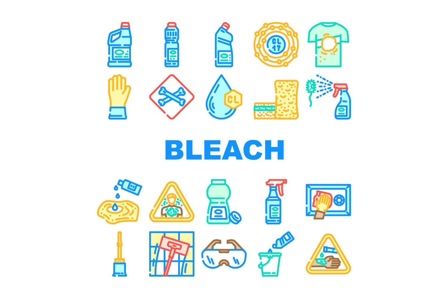 bleach clean germicide disinfect icons set vector. hygiene cleanse, bacteria virus, pathogen deodorize, sanitize, sterilize purify bleach clean germicide disinfect color line illustrations