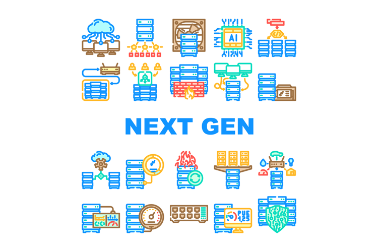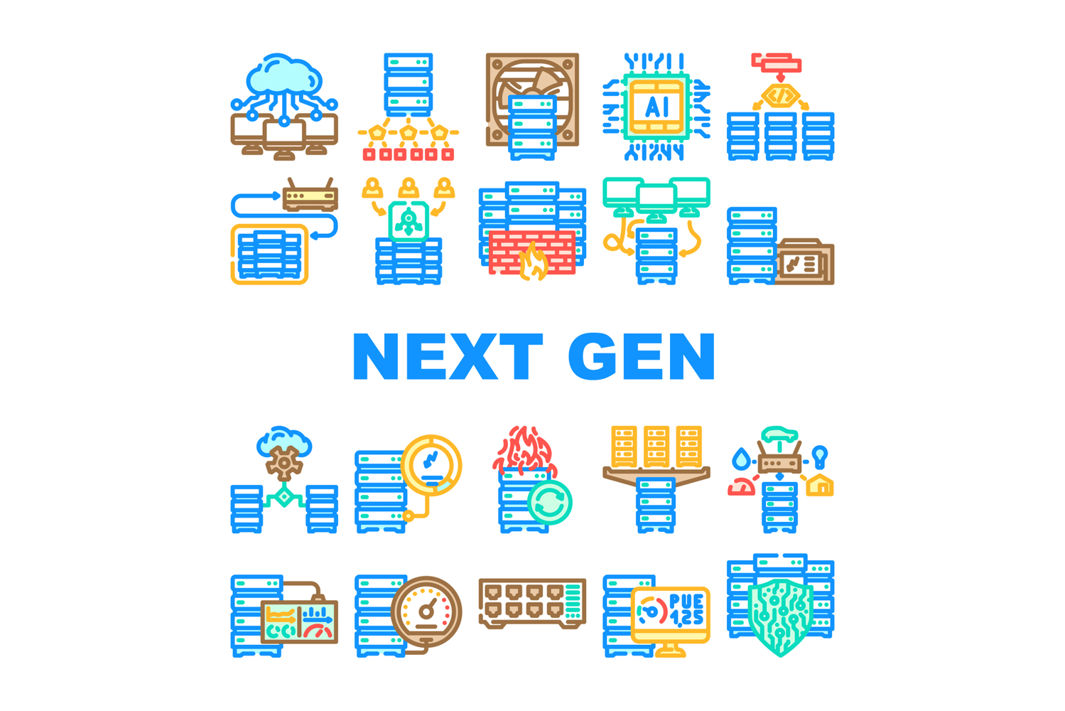 next gen data center virtual icons set vector. automation scalability, efficiency sustainability, cloud, edge, ai, iot, security next gen data center virtual color line illustrations
